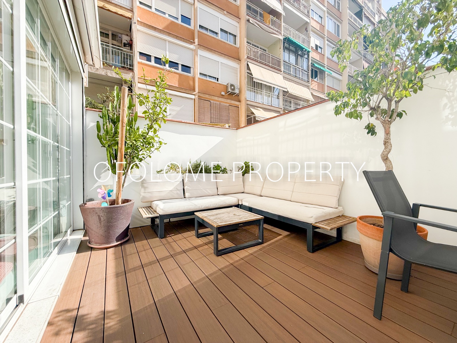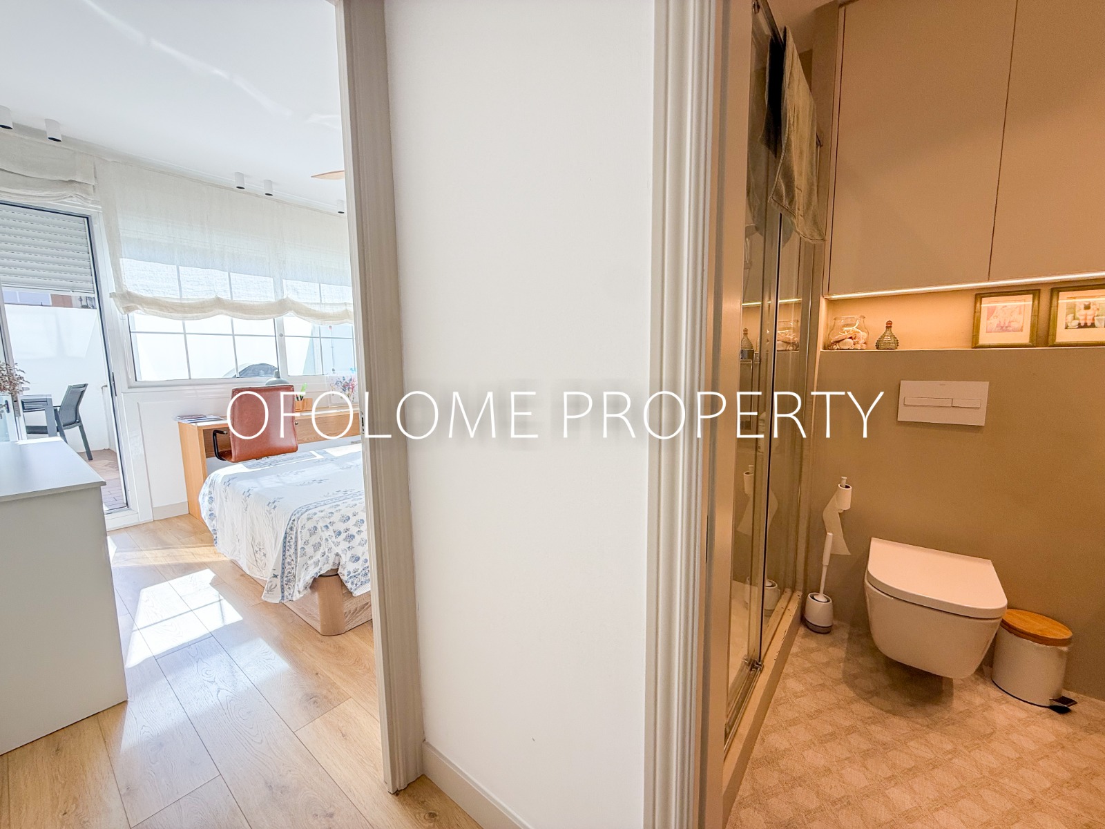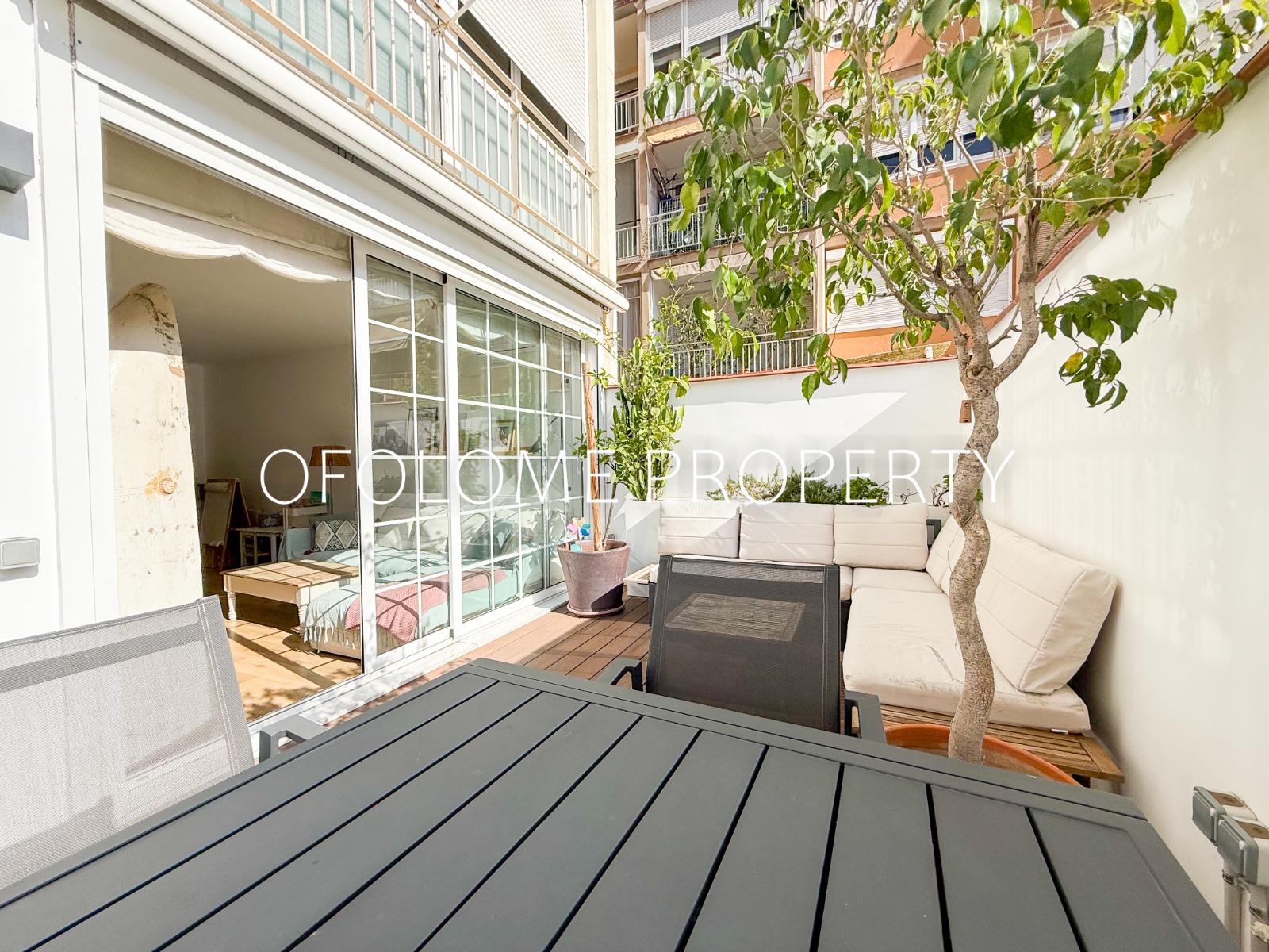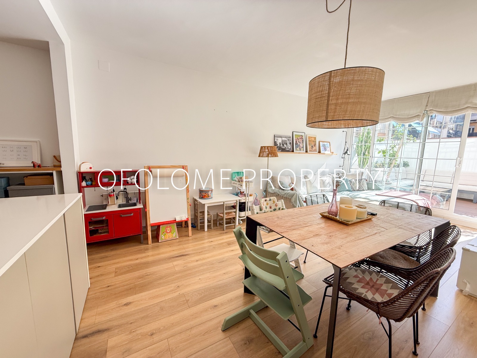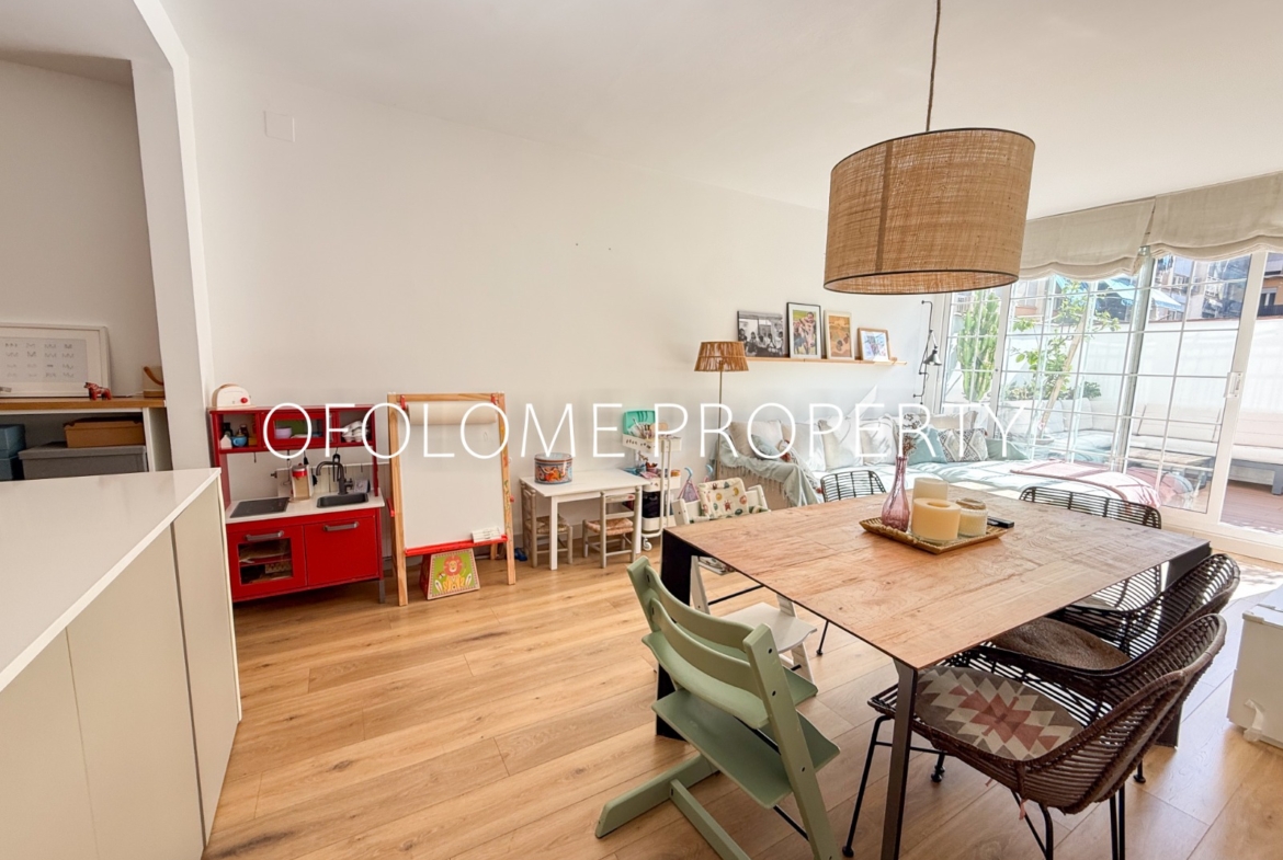El salón-comedor, de 21,8 m², ofrece amplitud, luminosidad y confort. Gracias a sus grandes ventanales de aluminio, la luz natural inunda la estancia durante todo el día, creando un ambiente acogedor y alegre. Desde aquí se accede a una elegante terraza de 17 m², un verdadero lujo en pleno centro de Barcelona. Este espacio exterior te permitirá disfrutar del clima mediterráneo durante todo el año: organizar cenas al aire libre, hacer barbacoas con amigos o simplemente relajarte al atardecer con una copa de vino.